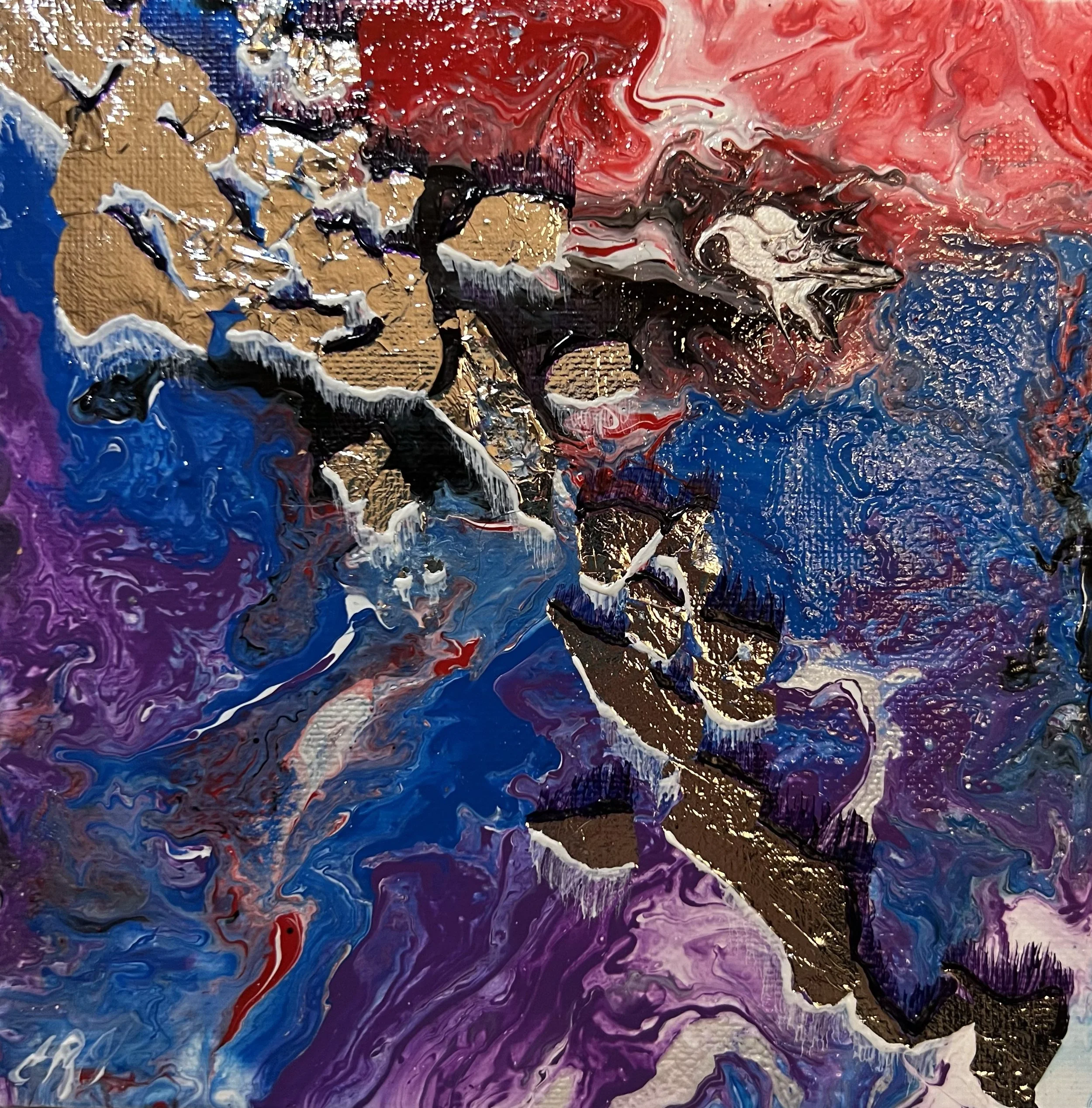 I started with blue, red, purple, and white. But it seemed too cheery, and I’m not cheery. So I added some silver leafing and black shadows to make it feel more like what’s in my head.