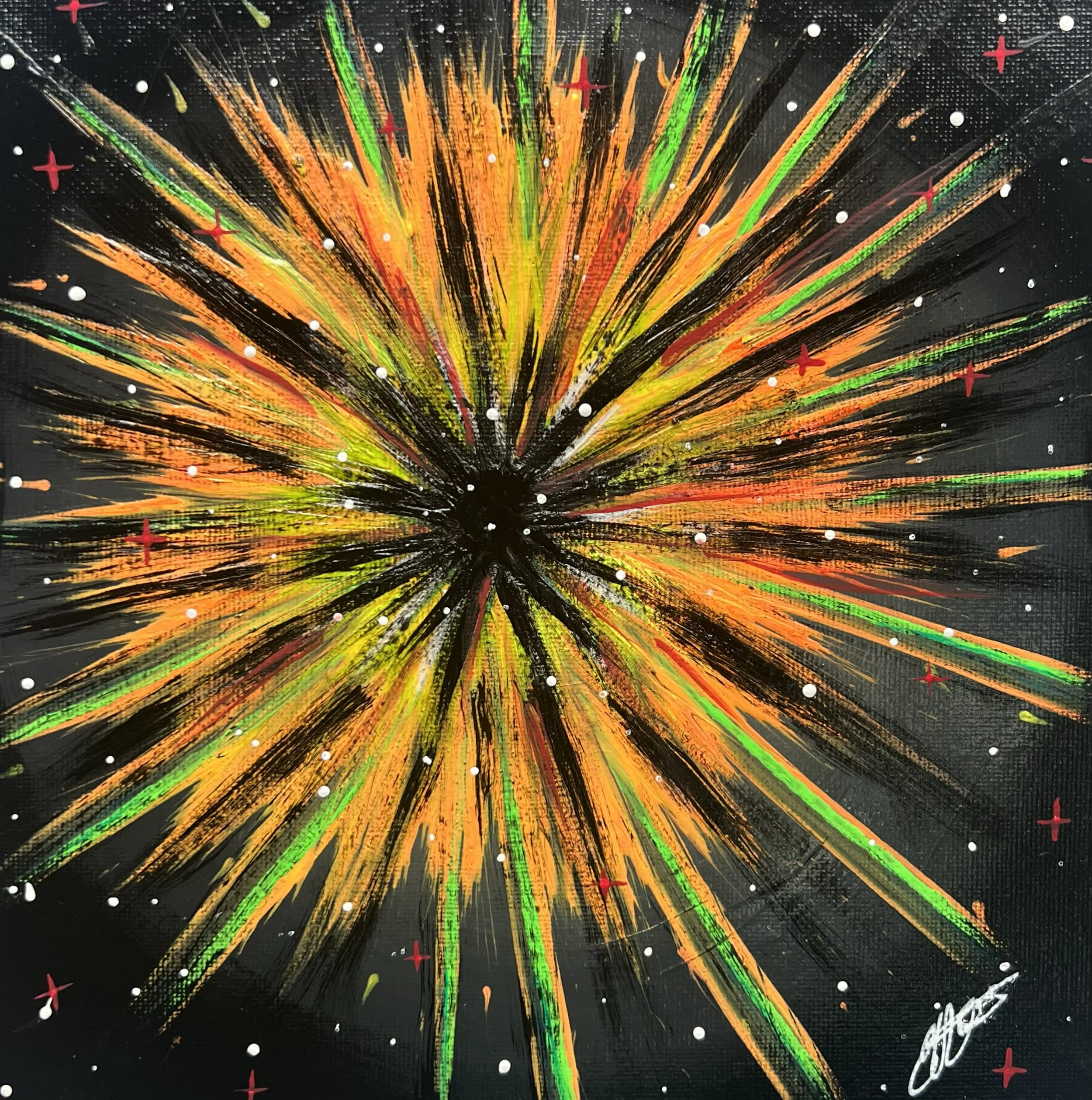 So of course, when it came time to do today’s painting, I wound up creating what my brain feels like. And the painting evolved throughout the day, kind of like a supernova or the Big Bang. The neon paint even glows in the dark.