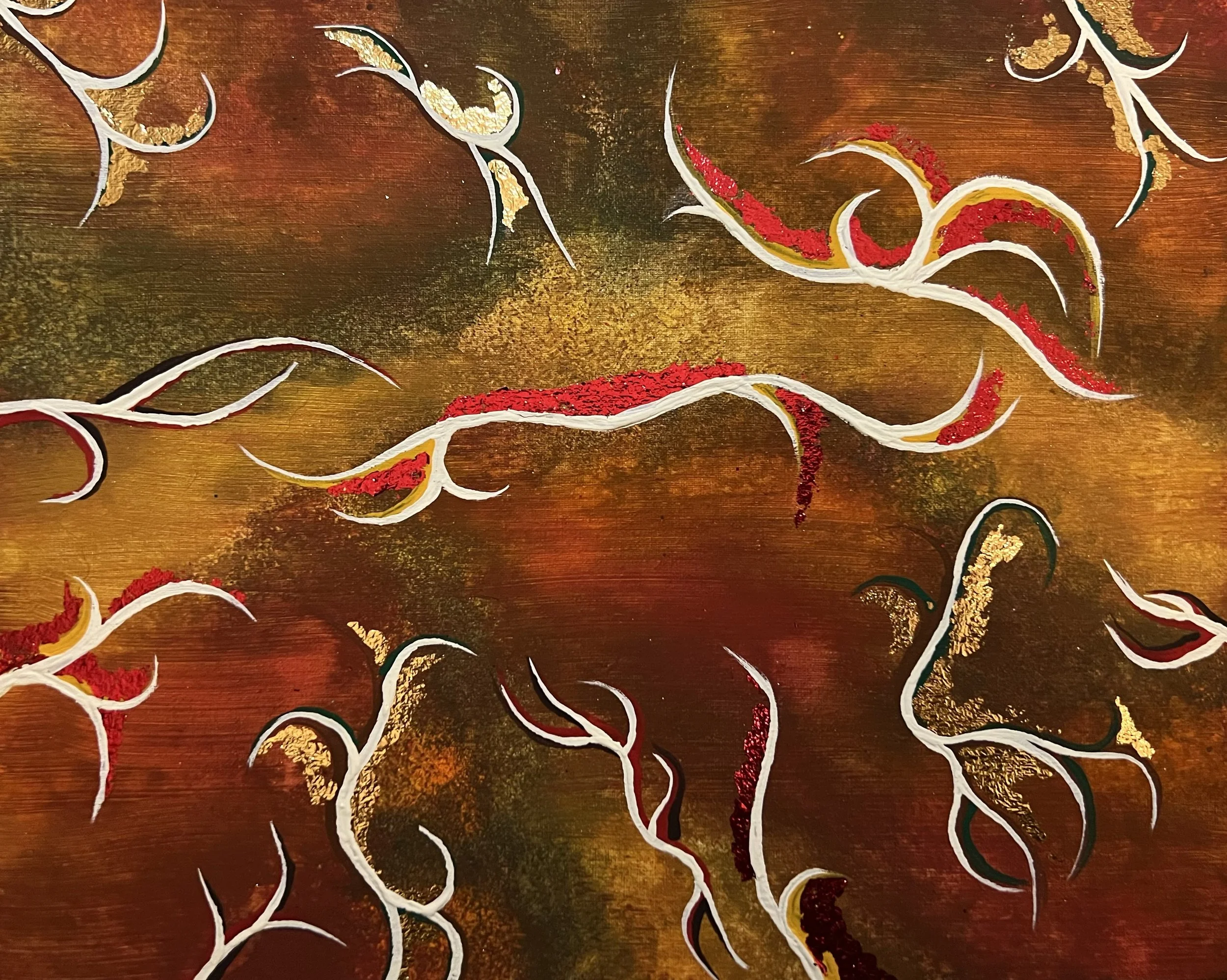 All of this is to say that in my efforts to feel fall, I did this painting. I wanted the richness of the reds, oranges, ochres, browns and the little bit of greens hanging on. This painting conveys, not only my desire for fall, but my fears of there never being a true fall again. In adding the gold leaf to it, it’s that glimmer of hope that I may still have, deep down. That people will wake up. You can’t wish natural disasters away or debate them away. We have to do something. We are on the precipice right now. This planet. Humans as a species. Something needs to be done right NOW. Not a five year plan or a ten year plan, but right NOW. If we do not change, we will not only destroy ourselves, we will destroy all life on this planet.