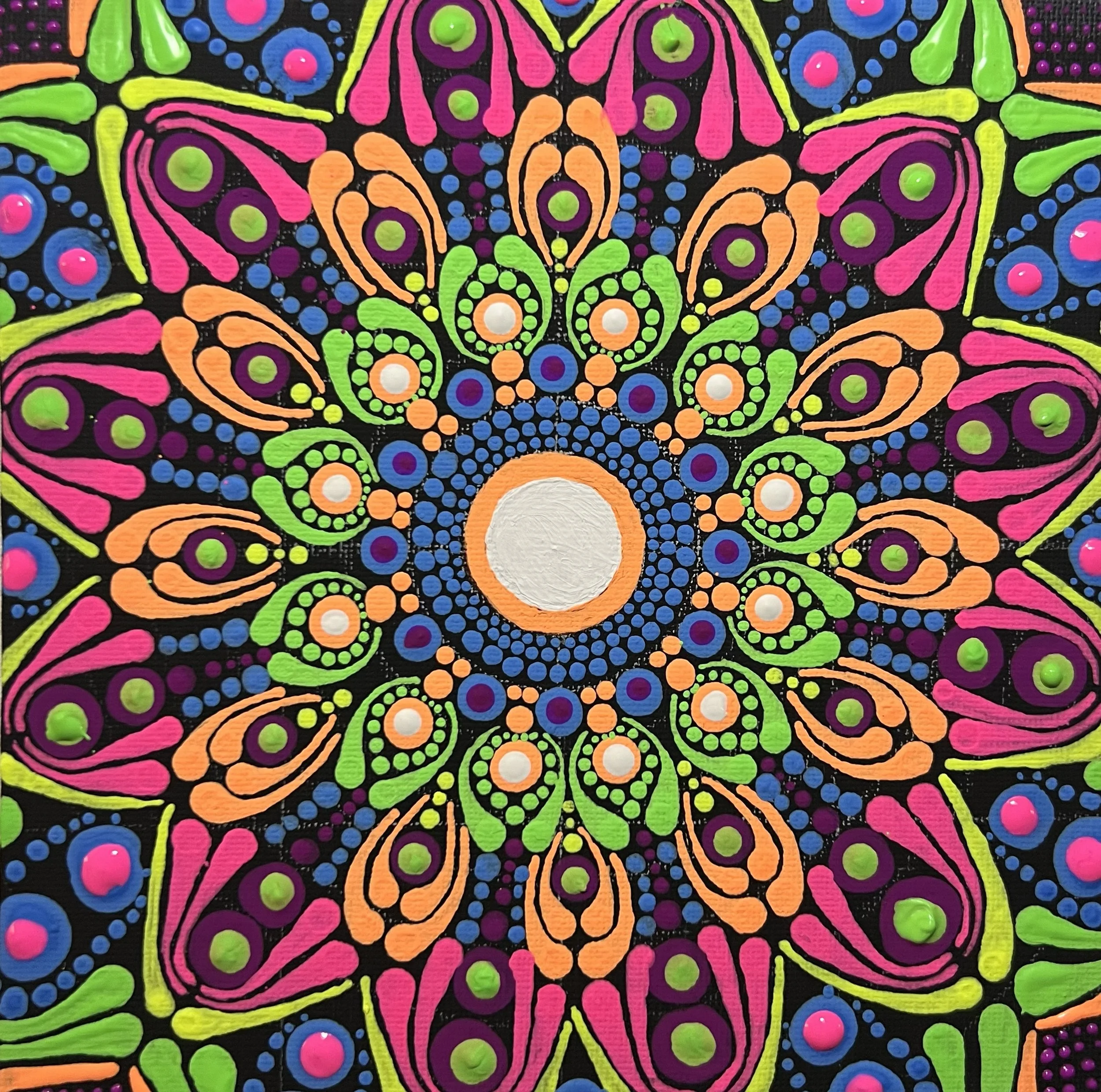 This is for my step-mom. She has a deep love for sugar skulls and all things Frida Kahlo. So with her in mind, I grabbed a small 4x4 canvas and started a mandala that would represent who she is.