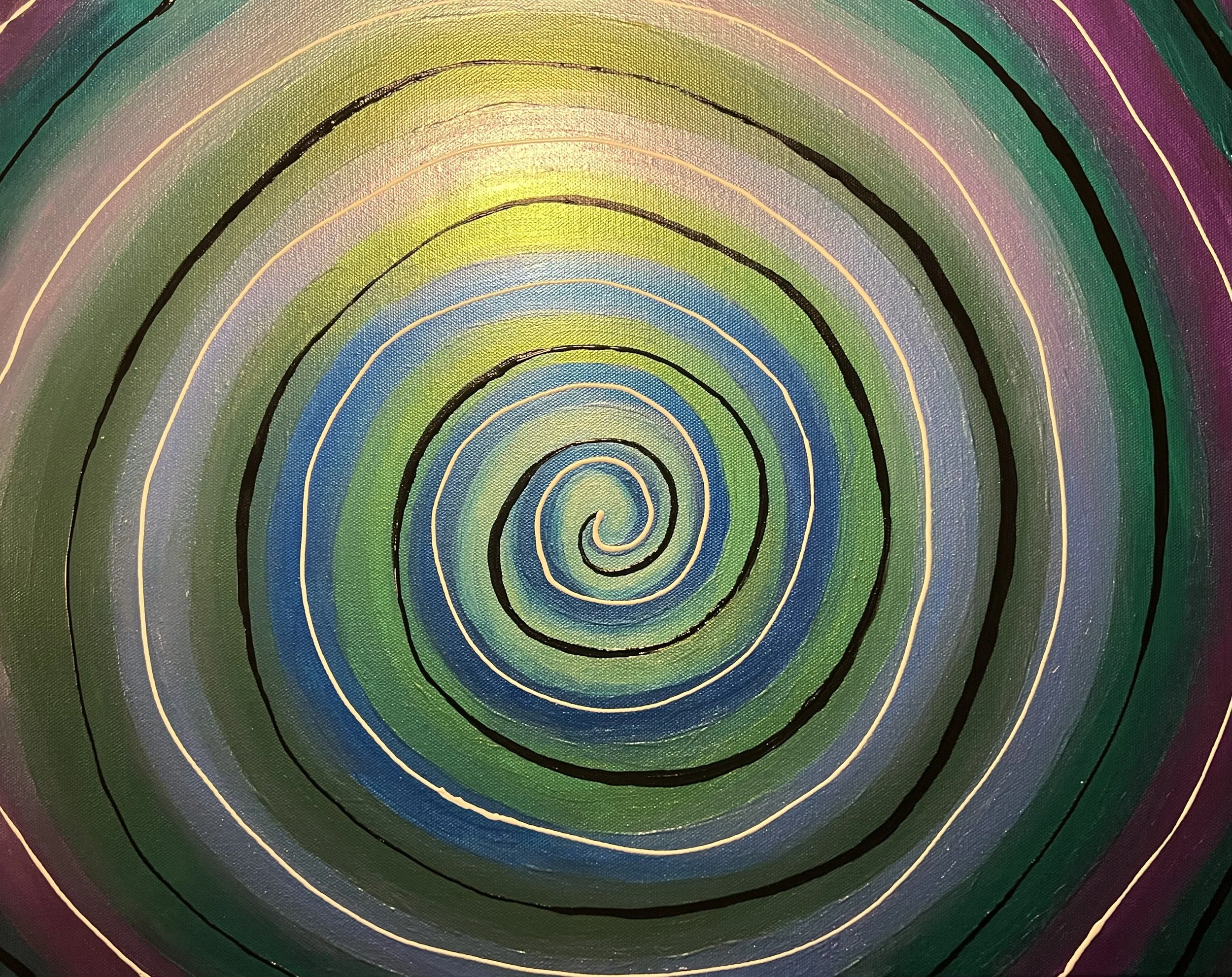 I wanted to use my color shifting, iridescent paint tonight and this spiral gradient just made sense. They didn’t blend as much as I hoped they would. Not sure if it’s the paint, or the way I was painting. Either way, I decided that it was too plain, so I added the black and white stripes.