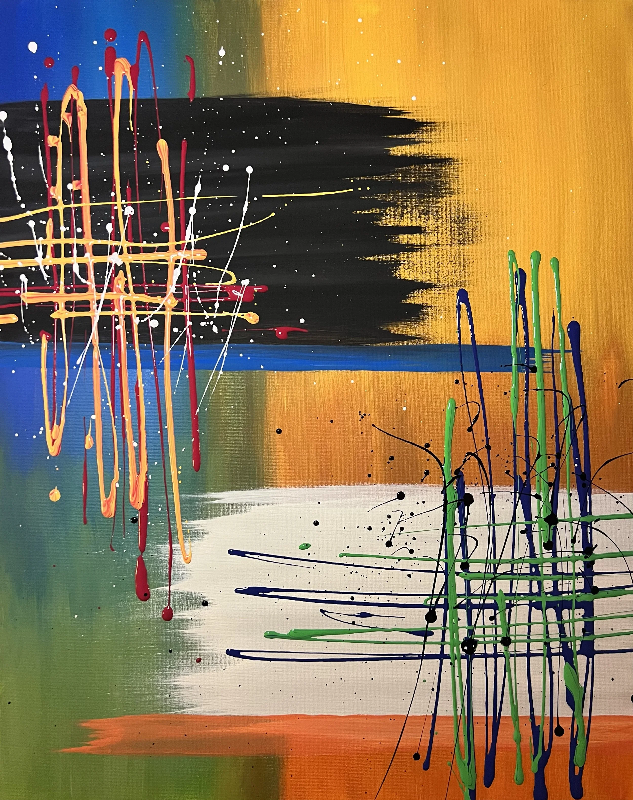 This is a 16x20, so a little on the larger side. I didn’t want to pour, just paint. I started with the yellow, then blue, then orange, then green. I liked it, but it was lacking. That’s when I added the black and white. But it still felt like it was missing something, so I added the lines and splats.