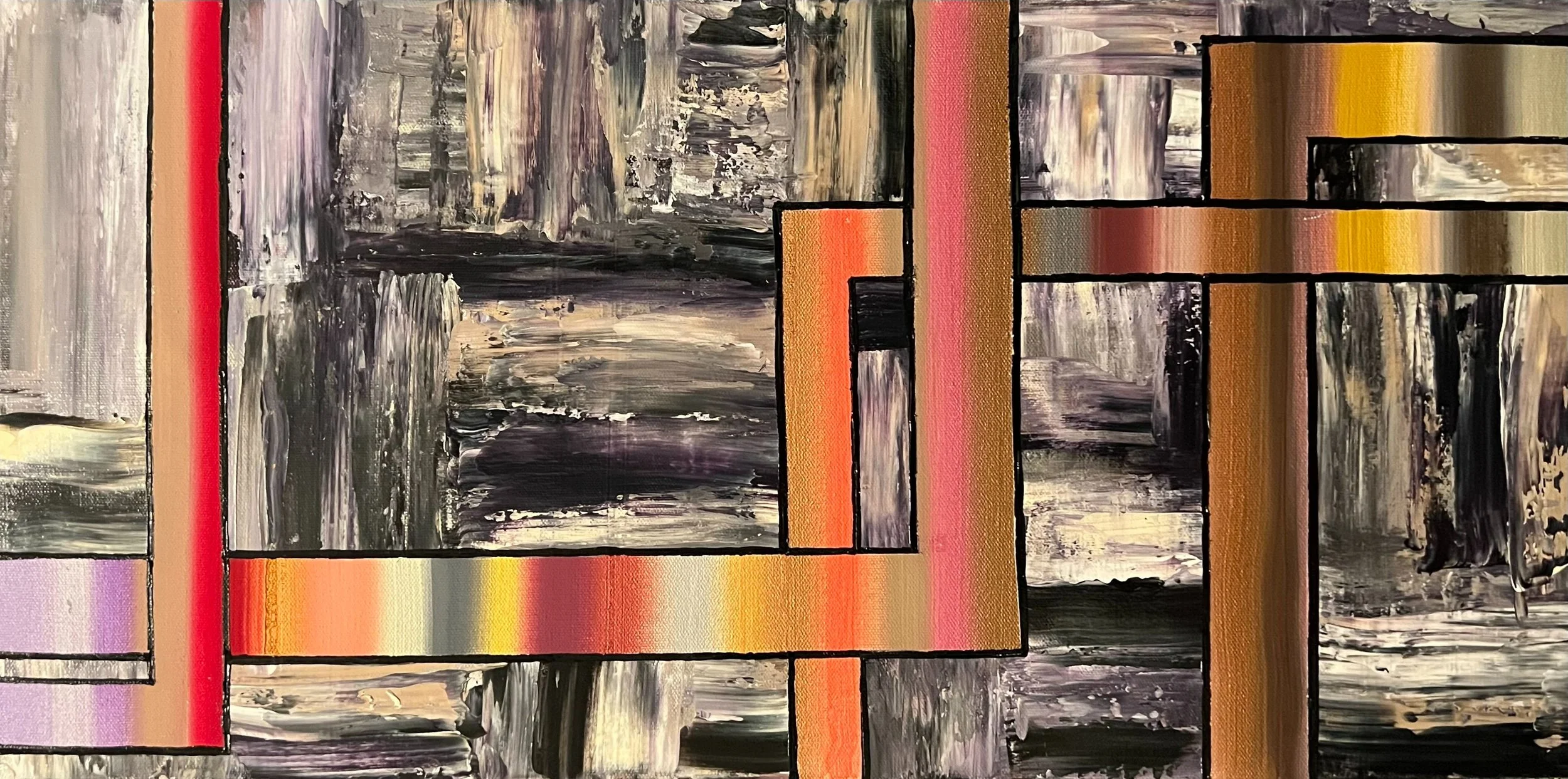 When I finally got to feeling okay, I painted. I started with gouche stripes of color… almost cheery colors. Then taped off random areas, and messed everything up. On purpose, of course. I used grays, silvers, purples, and blacks. Then peeled the tape off to reveal the color. It looked unfinished, so I outlined the stripes to make it look like they’re overlapping.