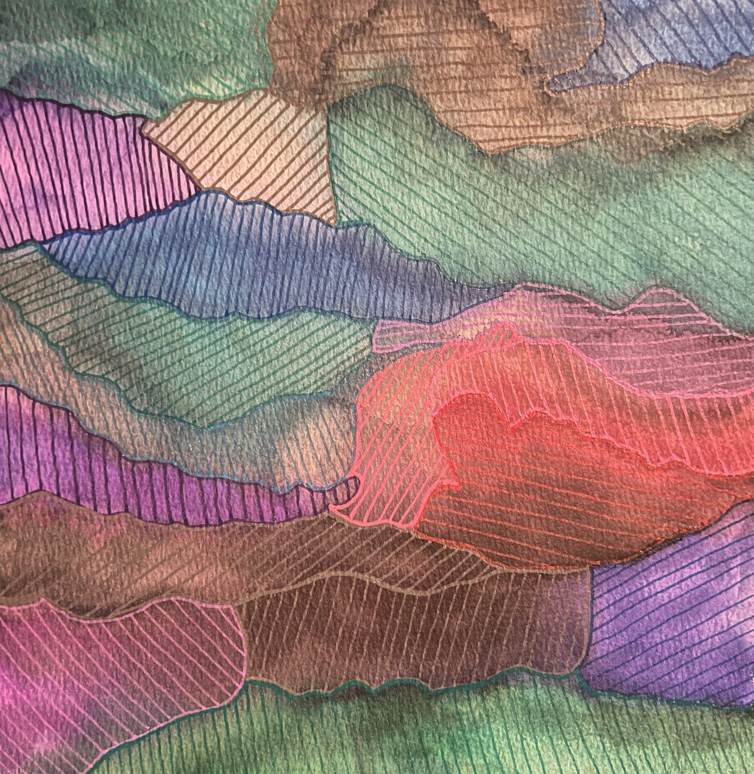 After a lap, I settled down at one of the table areas that are less populated, and began to paint. I brought both watercolor and acrylic pens. I stuck with dark and dreary colors and it eventually morphed into this. I poured water from the top and shook it out to get this almost sheets of rain look.
